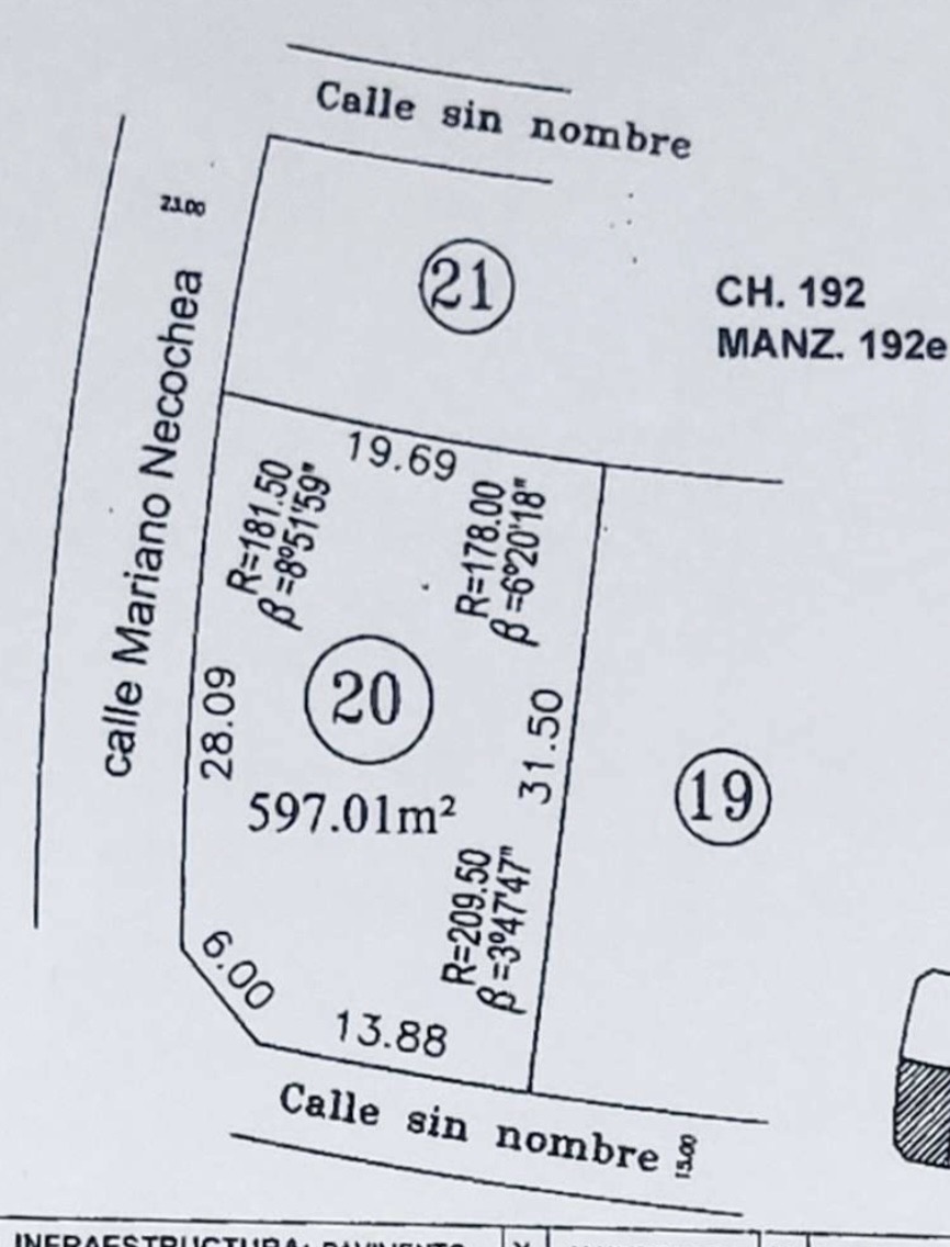 Lote irregular, Frente: 13,88, ochava: 9 laterales: 31,50 Fondo: 19,69